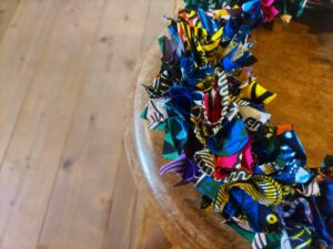 2025/11/15 常連さんからのオーダーでアフリカンプリントのハギレを使ってリース製作!久々のリース作り、楽しかったな♪ ハギレは捨てちゃダメです!!色々使えます♥11/15(土)~11/18(火)ひねもすのたりOPENです☆